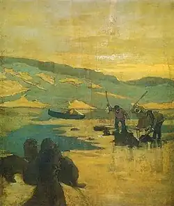 Одно из самых удачных панно — «Ловля рыбы на Мурманском море» — изображало борьбу поморских рыбаков с морской стихией. Фактически документируя рабочий момент, Коровин в то же время извлекал из мотива монументально-декоративную образность, подчёркивая её колоритом, цветовым и линейным ритмом, пространственной композицией. Лаконизм ритмов отличал панно от станковых работ художника на тему Севера. Выстраивая цикл, Коровин старался избежать монотонности в цвете и композиции. В «Ловле рыбы» он применил горизонтальный формат, близкий к панорамности, а в цветовой гамме деликатно выявил контраст между розовеющим небом и водой. Сам эпизод был развёрнут на переднем плане, а высокий горизонт, делавший почти невидимым небо, переключал внимание на море и лодки. Зелёно-синяя масса воды заполняла почти всё пространство холста, а на её поверхность была нанесена голубая рябь, напоминавшая орнаменты, что усиливало декоративный эффект. Небо изображалось узкой полоской серого, окрашенного на горизонте розовым цветом заката. В движениях обобщённых силуэтов рыбаков в лодках выражалась непоколебимость человеческой воли, а в водной поверхности — могущественная сила природы. На панно рыбаки вступали в спор со стихией и в то же время сливались с ней. В интерпретации Коровина эпизод повседневной жизни приобрёл одновременно и значительность монументального образа, и эффектность декоративной живописности. Колористический строй панно был направлен на то, чтобы дать зрителю почувствовать, что перед ним изображён именно Крайний Север — тона неба и воды были лишены всякой теплоты[69][70].