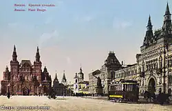 Летом 1909 года по Красной площади был пущен трамвай: первую линию рельс проложили в виде петли от Забелинского проезда к Верхним торговым рядам, далее — к памятнику Минину и Пожарскому в центре площади и собору Василия Блаженного. Затем маршрут следовал по Васильевскому спуску на Москворецкий мост[61][62][63]. На фотографиях начала века уже видны тонкие дорожки из асфальта, положенные прямо на булыжную мостовую. С 1938 года на площади разрешили движение автотранспорта[64][65].