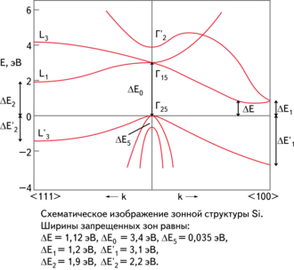 Элементарный кремний в монокристаллической форме является непрямозонным полупроводником. Ширина запрещённой зоны при комнатной температуре составляет 1,12 эВ, а при Т = 0 К — 1,21 эВ[9]. Концентрация собственных носителей заряда в кремнии при нормальных условиях составляет около 1,5⋅1010 см−3[10].