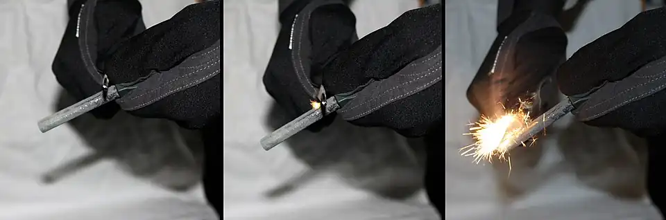 - кресало приводится в движение со скоростью, достаточной для образования снопа жёлто-оранжевых искр. Искры поджигают трут;