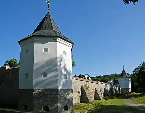 Окруженная стенами территория монастыря в плане имеет форму неправильного пятиугольника. Некогда главным храмом обители служила деревянная Преображенская церковь — трёхзрубная, трехглавая, характерная памятка галицкой школы народной архитектуры. Построили её в 1658 г. львовские мастера Андрей и Адам, расписывал живописец Н. Петрахнович.