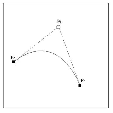 Квадратичная кривая Безье (n = 2) задаётся тремя опорными точками: P0, P1 и P2.