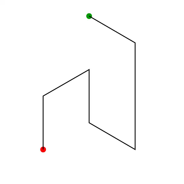 | Четвёртая стадия кривой Госпера | Ломаная линия от красной точки до зелёной показывает один шаг построения кривой Госпера. |