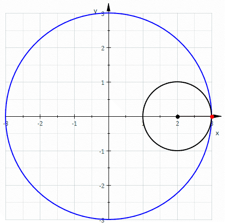 где a — радиус катящегося круга, b — радиус большего круга, по которому катится вышеупомянутый круг. (На рисунке выше b = 3a.)