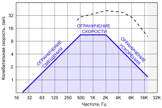 - ↑ Постоянная амплитуда смещения до частоты 500 Гц, постоянная амплитуда скорости выше этой частоты.