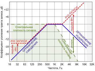 Существуют два основных режима записи гармонического сигнала на лаковый диск. В режиме постоянства амплитуд смещения[46] амплитуда смещения канавки зависит только от амплитуды записываемого электрического сигнала и не зависит от его частоты. При этом скорость изменения смещения растёт прямо пропорционально частоте сигнала и рано или поздно достигает неприемлемо высоких значений. В режиме постоянства амплитуд колебательной скорости[46] от частоты не зависит амплитуда скорости изменения смещения канавки, а амплитуда смещения обратно пропорциональна частоте сигнала. Наиболее распространённые электромагнитные звукосниматели чувствительны именно к колебательной скорости, поэтому воспроизведение пластинок, записанных в этом режиме, не требует какой-либо частотной коррекции. Однако такие записи отличаются неприемлемо высоким относительным уровнем шума на средних и особенно высоких частотах[46]. Из-за этих недостатков ни один из двух режимов не применим в чистом виде. Все[51] практические системы звукозаписи сочетают участки обоих режимов: на низких частотах рекордер работает в режиме постоянства амплитуд смещения, на средних — в режиме постоянства колебательной скорости. Переход от одного режима к другому происходит в особом фильтре предыскажений, а частота раздела выбирается так, чтобы вписать в заданные технологией пределы максимум полезного сигнала.