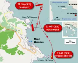 У судоходной компании «Коста Крочере», которой принадлежал корабль, была традиция приветствовать жителей и гостей острова Джильо гудками, подаваемыми с близкого расстояния. Суда подходили без каких-либо согласований, не имея на борту достаточно подробной карты для прокладки курса вблизи берега. Вечером накануне крушения капитан Франческо Скеттино в очередной раз сошёл с привычного маршрута в сторону Джильо. Отключив автопилот и систему судовой тревожной сигнализации инерциальной навигации, он начал приближаться к острову. На капитанском мостике в этот момент по приглашению Скеттино находилось несколько посторонних лиц, которые отвлекали его и других судоводителей. В результате «Коста Конкордия» опасно приблизилась к скалистому берегу. У руля вахту нёс индонезиец Якоб Русли. На несколько команд, отдаваемых Скеттино на английском, он реагировал с промедлением, переспрашивал заданный курс судна, перепутал направления поворота. Череда ошибок и задержек привела к тому, что расстояние до берега сократилось до 350 м. В 21:44 прямо по курсу показались скалы. Носовую часть удалось отвернуть, но корму занесло на рифы. Гранит проделал в корпусе 53-метровую пробоину.