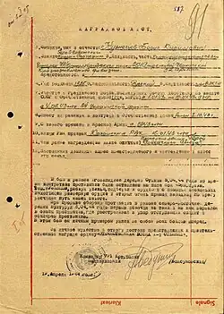 - ↑ Указ Президиума Верховного Совета СССР от 22 февраля 1944 года «О присвоении звания Героя Советского Союза офицерскому, сержантскому и рядовому составу Красной Армии». КонсультантПлюс. Дата обращения: 15 ноября 2020. Архивировано 20 июня 2021 года.