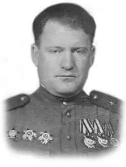 13 сентября 1944 года в должности начальника штаба 1270-го стрелкового полка 385-й стрелковой дивизии умело организовал действия полковых подразделений, которые успешно захватили город-крепость Ломжа (Польша), за что был представлен к ордену Красного Знамени, но приказом по 49-й армии от 17.10.1944 был награждён орденом Отечественной войны 2-й степени.