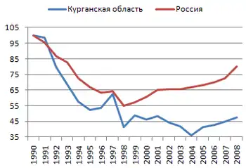 Динамика индексов промышленного производства в Курганской области и в России в 1991—2009 годах, в процентах от значений 1991 годаДинамика индексов объёма продукции сельского хозяйства в Курганской области и в России в 1990—2008 годах, в процентах от значений 1990 годаСредний доход населения Курганской области в% к среднероссийскому