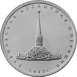 12 августа 2020 года Банк России выпустил в обращение памятную монету из недрагоценного металла номиналом 5 рублей «Памятная монета, посвящённая Курильской десантной операции»[35].