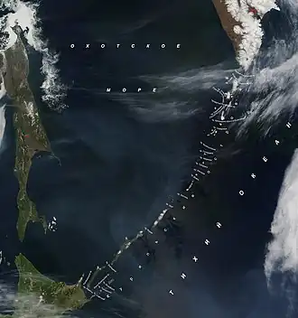 Кури́льские острова́ (айн. Чупка[2], Тюпка, Цюпка[3] /север.-кур./, Цюпука /южн.-кур./[4], вкупе с Камчаткой[3] — «место восхода солнца», а также Курумиси, «людская земля»[5]; яп. 千島列島 Тисима рэтто: — «архипелаг тысячи островов»), также известные как Кури́лы, — цепь островов вулканического происхождения между полуостровом Камчатка и островом Хоккайдо, отделяющая Охотское море от Тихого океана чуть выпуклой в сторону океана дугой. В научных работах по геологии и геотектонике рассматривается как Кури́льская островна́я дуга́.
