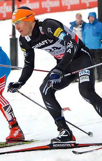 Использует лыжи и ботинки производства фирмы Rossignol.