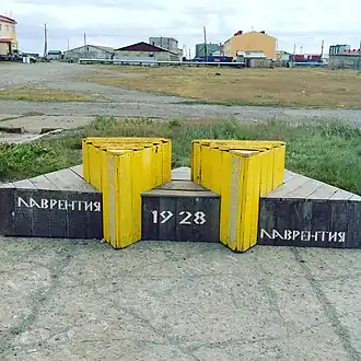 Село Лаврентия основано в 1927 году, когда здесь начала действовать чукотская культбаза[27], которая должна была соединить различные административно-хозяйственные учреждения региона и способствовать закреплению советской власти (пароход с построечным лесоматериалом и рабочими вошёл в залив Лаврентия в августе того же года)[28][29]. К осени 1928 года культбаза состояла из ряда построек: ветеринарного пункта, мастерской по ремонту руль-моторов и бытовой техники, больницы, цинкового склада, дома фактории, школы-интерната и трёх жилых домов[30].