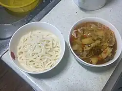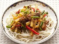 - Дунганский рецепт. В нём допускается любое количество жидкости по вкусу. Есть вариант приготовления с жареной лапшой (жади — люмян).