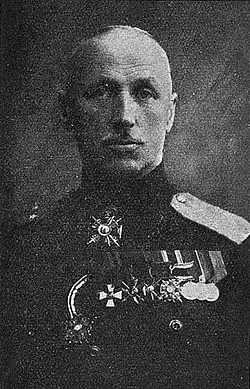 За то, что, состоя в названном полку по призыву из запаса гвардейской пехоты в чине штабс-капитана, в бою у м. Чарторийск 5-го октября 1915 года и будучи начальником передового отряда 6-й роты названного полка, получив задачу прорвать укрепленную позицию германцев у м. Чарторийск и овладеть Чарторийском, блестяще выполнил эту задачу: пользуясь предрассветной темнотой, провел свой отряд по считавшемуся непроходимым болоту и, невзирая на сильный ружейный и пулеметный огонь, без выстрела, смелым штыковым ударом овладел окопами германцев, взял в плен около 300 нижних чинов с офицерами 1-го гренадерского кронпринца Фридриха полка, 2 пулемета и 2 орудия. После этого привел свой отряд в порядок и, не давая противнику опомниться, умелым маневром, с угрозою тылу германцев, энергично атаковал м. Чарторийск, несмотря на упорное сопротивление, овладел им и преследовал затем противника за пределы этого местечка; при чем захватил еще одно орудие и взял в плен более 100 нижних чинов с офицерами того же гренадерского полка. Всего взято в плен 12 офицеров, 1 врач, 418 нижних чинов и захвачено 2 пулемета и 3 орудия.