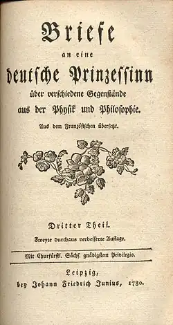 Огромную популярность приобрели в XVIII веке, а отчасти и в XIX, эйлеровские «Письма о разных физических и философических материях, написанные к некоторой немецкой принцессе…» (1768), которые выдержали свыше 40 изданий на 10 языках (в том числе 4 издания на русском). Это была научно-популярная энциклопедия широкого охвата, написанная ярко и общедоступно[55].