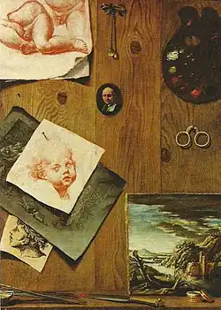 Под обрамлённым рамой из прибитых к деревянной стенке кожаных ремней рисунком профиля старика находится овальная терракота, изображающую игры путти в стиле барельефов скульптора Франсуа Дюкенуа (это не единственный случай использования подобных его барельефов де Ле Моттом)[7]. Его творчество было связано с формированием классицизма. Дюкенуа увлекался античной и ренессансной классикой. Он воплощал в рельефах с изображением путти идеалы искусства греческих и римских скульпторов древности, о чём свидетельствуют рациональная гармония, пластика образов, а тонкая игра света и тени, мягкость моделировки восходят к венецианской живописи XVI века[21]. Слева от барельефа скульптурное изображение женской головы, оно соседствует с полкой, на которой размещены инструменты художника. Здесь находятся его палитра, связка кистей, скреплённых ремешком, и двухсекционная металлическая коробка, которая, очевидно, должна была использоваться для их очистки[7].