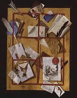 Набор предметов, изображённый на полотне, по мнению искусствоведов, должен интерпретироваться как «всё, что понравится». Случайное собрание сложенных бумаг, тетрадей и других принадлежностей для переписки, закреплённых на стене, стало одной из любимых тем обманок в 1650 году. В XVII веке было принято прикреплять на стену несколько досок пихты, на такую панель прибивали ленту или ремень и использовали для хранения на видном месте писем, документов, рисунков и других подобных предметов. Эта композиция была для художников способом продемонстрировать свою виртуозность в создании обманок[8].