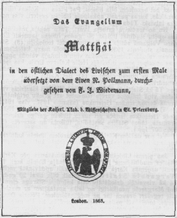 Первая книга на ливском языке (Евангелие от Матфея) была издана в 1863 году в Лондоне сразу на восточном и западном говорах курляндского диалекта[31]. Переводчиками были Ника Поллманн (носитель восточного говора курляндского) и Ян Принц с сыновьями Янисом и Петерисом (носители западного говора). В плане орфографии издание следовало системе записи Ф. Видемана, состоявшей из 36 букв с применением диакритических значков. Общий тираж составил 250 экземпляров[32]. Однако сами ливы получили только по одному экземпляру на каждом диалекте[33].