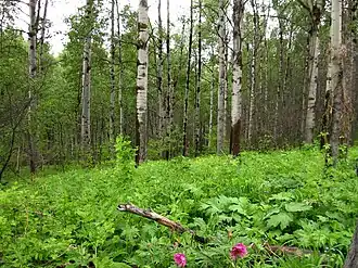 Во вторичных лесах из пушистой берёзы почва покрыта зелёным мхом, здесь сохраняются многие растения, характерные для еловых и сосновых лесов и поселяются луговые травы. В полосе южной тайги во вторичных берёзовых лесах в травяном покрове встречаются виды, характерные для дубрав: яснотка зеленчуковая, медуница неясная, осока волосистая, чина весенняя и другие, мхов здесь гораздо меньше. На месте липовых и дубовых лесов обычно возникают березняки со снытью. Для зоны широколиственных лесов характерны вторичные осиновые леса со снытью и осокой волосистой.