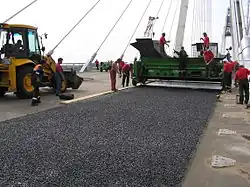 - Высокая степень адгезии литого асфальтобетона к нижележащим слоям, их «спекание» при повышенной температуре укладки, в том числе, с материалами рулонной наплавляемой гидроизоляции. Данное свойство позволяет системе покрытия и гидроизоляции функционировать как единое целое с пролётным строением мостового сооружения.