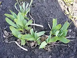 Листья в числе 6–8, сближенные у основания стебля, линейные с закруглёнными кончиками, шириной 1–2 см, в длину до 30 см, сизые, тупые, серповидные, гладкие. Листовая пластинка имеет небольшой винтообразный изгиб вокруг продольной оси. Листья хрупкие и сочные, на изломе выделяют слизистый сок, слабоострые на вкус.