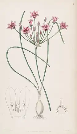 Травянистое растение с мелкими продолговатыми луковицами диаметром 1—1,5 см. Листья 3—5-гранные, полые, шириной 1-3 мм, по длине почти равны цветоносу (его длина составляет 20—40 см). Цветки c нежно-фиолетовыми лепестками венчика собраны в редкоцветковый, почти полусферический зонтик[3][4].