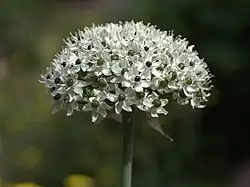 Цветоносы гладкие, округлые в сечении, 80–100 см высотой. На цветоносе плотное зонтиковидное соцветие со звездчатыми цветками диаметром до 9 мм. Цветки 0,6—0,8 см длиной, зеленовато-жёлтые, собраны в полушаровидный зонтик[1]. Листочки околоцветника белые с зелёной средней жилкой; пыльники фиолетовые или жёлтые. Завязи чёрно-зелёные в период цветения, но зелёные в молодом возрасте или после цветения.