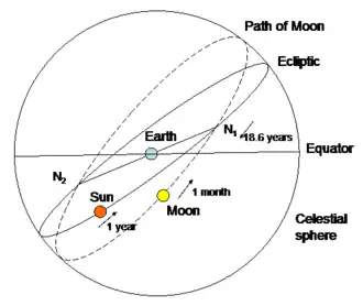 Как видно для наблюдателя на Земле, на мнимой небесной сфере Луна пересекает эклиптику два раза в месяц в позициях, называемых узлами. Полнолуние может прийтись на такую позицию, на узел, тогда можно наблюдать лунное затмение. (Примечание: масштаб не соблюдён.) |