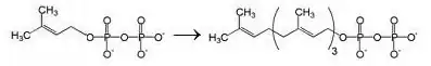 - Первый этап — это образование изопреновой цепи: из изопренилфосфата в присутствии геранилгеранилсинтазы образуется геранилгеранилпирофосфат: