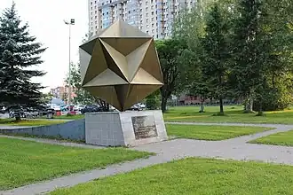 Памятник расположен вблизи станции метро «Академическая» перед зданием бывшего кинотеатра «Современник» по адресу проспект Науки, дом 25. Представляет собой золочёный многогранник с 32 вершинами и 90 рёбрами, расположенными так, что от каждого ребра отходит по 5 граней, образующих при взгляде с любой стороны рельефную пятиконечную звезду — такую же, как рисовали на фюзеляжах самолётов[3][5][7][8].