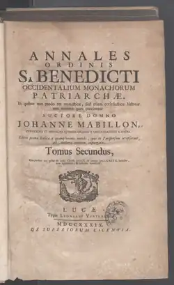 - «Annales ordinis S. Benedicti» (Париж, 1703—1739; Лукка, 1739—1745) — продолжение предыдущего издания, содержащее в себе жизнеописания не только святых, но и всех монахов-бенедиктинцев, действовавших на поприще христианской цивилизации.