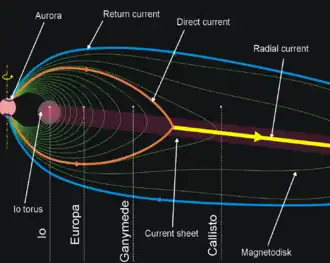 Ток, протекающий из ионосферы в плазменный слой, особо силен, когда соответствующая часть плазменного слоя вращается медленнее чем планета.[28] Ротация ухудшается в регионе между 20 и 40 RJ от Юпитера. Этот регион соответствует магнитодиску, где магнитное поле сильно растянуто.[29] Сильный постоянный ток в магнитодиске рождается в строго определённом диапазоне широт около 16 ± 1° от Юпитерианских магнитных полюсов. Эти узкие регионы соответствуют основным овалам полярных сияний Юпитера. (см.ниже.)[30] Обратный ток протекающий из внешней магнитосферы в районе 50 RJ входит в юпитерианскую ионосферу вблизи от полюсов, и замыкает электрическую цепь. Полный радиальный ток предположительно оценивается от 60 до 140 миллионов ампер.[21][28]