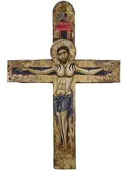 - 10. Расписной крест. Происходит из ц. Санта Мария делла Пьеве, Ареццо. Ныне хранится в Гос. Музее старинного и современного искусства, Ареццо. 1250-60гг.В верхней части креста – Благословляющий Христос; на правом и левом лучах – неизвестные святые; на табеллоне – Богородица и Иоанн Креститель; внизу – Отречение Петра.