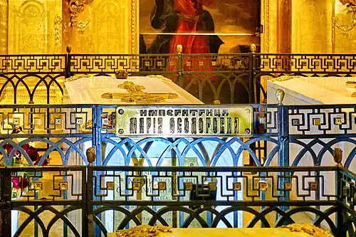 Печальное шествие двинулось из Зимнего дворца в час дня, в половине третьего прибыло в собор. В 3 часа 20 минут было совершено погребение[48]. Мария Фёдоровна погребена у алтаря, с левой стороны, между могилами мужа Павла I и сына Александра I. Из десяти детей Марии Фёдоровны на похоронах присутствовали только трое: Константин, Николай и Михаил[42]. Анна и Мария не приехали, Александр, Александра, Екатерина, Елена и Ольга умерли раньше матери.