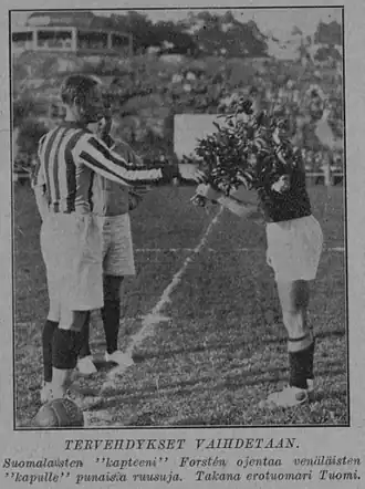 - ↑ Сильнейший (финны называли его «спартакиадным») состав сборной команды организации финских рабочих клубов TUL (Työväen Urheiluliiton jalkapallojoukkue). За проведение матча с советскими футболистами все игроки команды и арбитр были исключены из TUL (повторный матч через две недели ленинградцы играли уже с резервистами), после чего они перешли в клубы «буржуазного» чемпионата и стали выступать за национальную сборную. Целый ряд игроков этого состава весьма значим в финском футболе тех лет — Рейно Фри, Эрнст Грёнлунд (37 матчей за национальную сборную), Вильо Хальме (30 матчей), Лаури Синикари-Практиг (5) и другие.