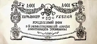Собственных бумажных денежных знаков махновцы не выпускали. Купюры, якобы выпущенные Повстанческой армией, являются подделкой[1][2][3].