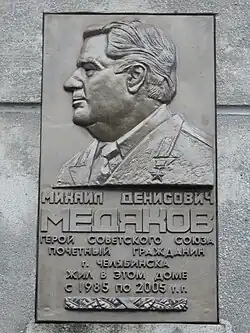 - ↑ Мемориальная доска Герою Советского Союза Медякову Михаилу Денисовичу. Челябинская область, г.Челябинск, ул.Коммуны, д.69.