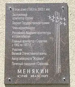 Ю́рий Ива́нович Менякин (1925—2002) — советский архитектор. Почётный гражданин города Саратова, Заслуженный архитектор РСФСР (1975), лауреат Государственной премии РСФСР (1987), лауреат премии Госстроя СССР, член-корреспондент Российской Академии архитектуры и строительных наук, участник Великой Отечественной войны. Автор Мемориального комплекса воинам-саратовцам, погибшим на фронтах Великой Отечественной войны 1941—1945 гг. «Журавли»; главный архитектор города Саратова (1962—1987).