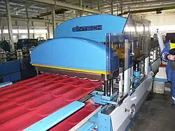 Производство металлочерепицы осуществляется на специальных полностью автоматических линиях путём профилирования металлического проката методом холодного давления. Сначала прокат проходит через систему профилировочных роликов, создающих волнообразный профиль. После этого холодной штамповкой формируется поперечная волна. Именно благодаря данному виду штамповки металлический лист приобретает форму черепицы. Далее осуществляется нарезка на листы необходимой длины. После этого уже готовые изделия укладывают в пачки и упаковывают в транспортные пакеты.