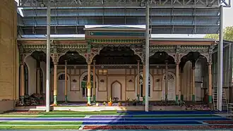 Входной портал — дарвозахона мечети — по архитектуре и орнаменту составляет органичный ансамбль со всеми постройками. Трёхчастный портал имеет три входных стрельчатых проёма, с возвышающейся прямоугольной средней частью крупных пропорций. Четыре возвышающихся купольных шестигранных фонаря завершают вертикаль входного портала. Декор портала представляет мозаичный изразцовый крупный геометрический рисунок в сочетании с майоликовым нежным мелким орнаментом гирих, стрельчатые ниши украшены растительным рисунком. П-образное мозаичное оформление портала абровыми зигзагами очень напоминает ферганские ткани для верхней одежды — хан атлас.
