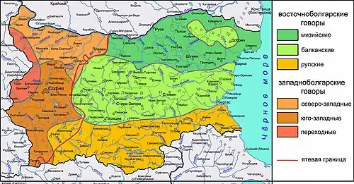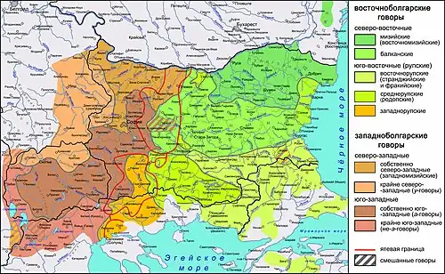 - ↑ Узенёва Е. С. Болгарская свадьба: этнолингвистическое исследование / Ответственный редактор С. М. Толстая. — М.: Индрик, 2010. — С. 205,. — 280, 212 (Карта 2. Диалекты болгарского языка) с. — (Традиционная духовная культура славян). — ISBN 978-5-91674-085-1. Архивировано 3 июня 2023 года.
