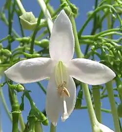 Белые цветки собраны в большие метёлки, источающие приятный аромат. Они двуполы и зигоморфны. Чашелистики цветка колокольчатые, имеют пять небольших лепестков. У цветка четыре тычинки с параллельными пыльниками, в отличие от большинства других растений этого семейства, у которых пыльники расходятся. Венчик представляет собой длинную трубку с пятью лопастями[3]. Как и у никтантеса печального (Nyctanthes arbor-tristis), цветки недолговечны[6] — распускаются ночью и опадают утром. Цветы издают очень приятный запах.