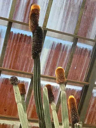 На кончике стебля находится цефалия, состоящая из плотно переплетённых щетинистых золотисто-жёлтых колючек. Цефалия вырастает на 10-15 см в год и с возрастом темнеет. Соцветие появляется внезапно и асимметрично на стебле. Цветки маленькие. Плоды продолговатой формы содержат всего от 10 до 20 семян[1].