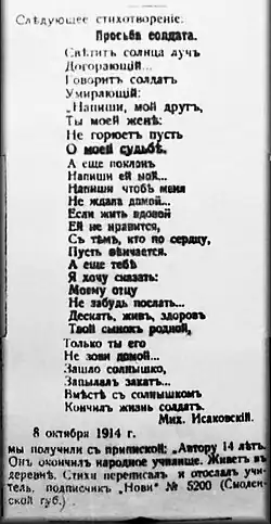 Михаи́л Васи́льевич Исако́вский (7 (19) января 1900 года, дер. Глотовка, Ельнинский уезд, Смоленская губерния, Российская империя — 20 июля 1973 года, Москва, СССР) — русский советский поэт, поэт-песенник, прозаик, переводчик. Герой Социалистического Труда (1970). Лауреат двух Сталинских премий первой степени (1943, 1949).