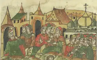 ![]() Убийство посадника Михалко (нижняя часть миниатюры). Иллюстрация из рукописи XVI века | |