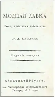 - ↑ Крылов И. А. Модная лавка // И. А. Крылов. Полное собрание сочинений. М.: Гос. изд-во худож. лит., 1945—1946. Т. 2, с. 488