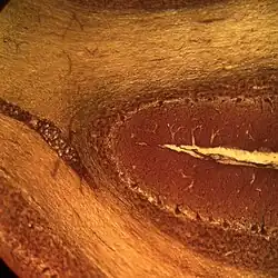 Червь и полушария покрыты серым веществом (корой мозжечка), внутри которого находится белое вещество. Белое вещество, разветвляясь, проникает в каждую извилину в виде белых полосок (лат. laminae albae). На сагиттальных срезах мозжечка виден своеобразный рисунок, получивший название «древа жизни» (лат. arbor vitae cerebelli). Внутри белого вещества залегают подкорковые ядра мозжечка[19].