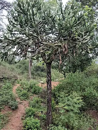 Суккулентное дерево или кустарник с округлой кроной высотой до 10 и более метров. Многоразветвленные побеги трёх-пятигранные, слегка крылатые по краям, покрыты зубцами. Образуются небольшие колючие щитки и шипы длиной до 6 мм.